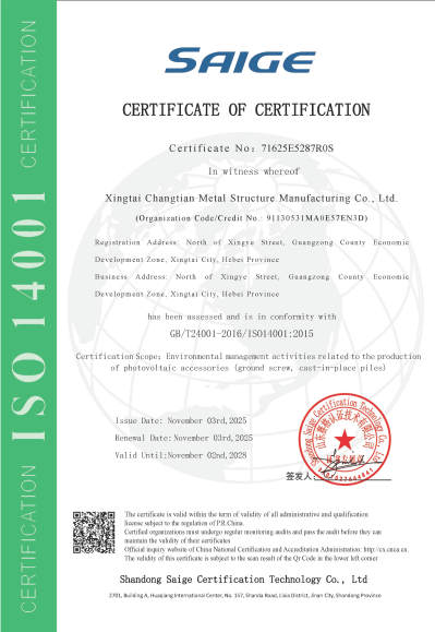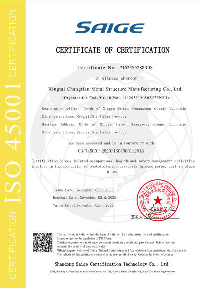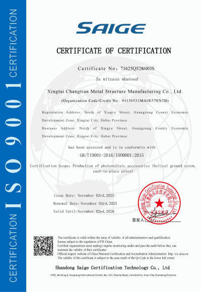 Hebei ShijingChangtian Metal Structure Products Co., Ltd. is located in Yongnian, Hebei Province, is a professional in the research and development, design, production and sales of photovoltaic support accessories as one of the manufacturing enterprises, to provide products the whole supply chain production solutions, currently we have two production plants in Hebei ShijingChangtian and Xingtai Changtian, the two factories cover a total area of 25,000 square meters. There are a number of automatic production lines, including photovoltaic bracket series, photovoltaic pile, brace, hot-dip galvanized bolts, anchor bolts, and other product lines.